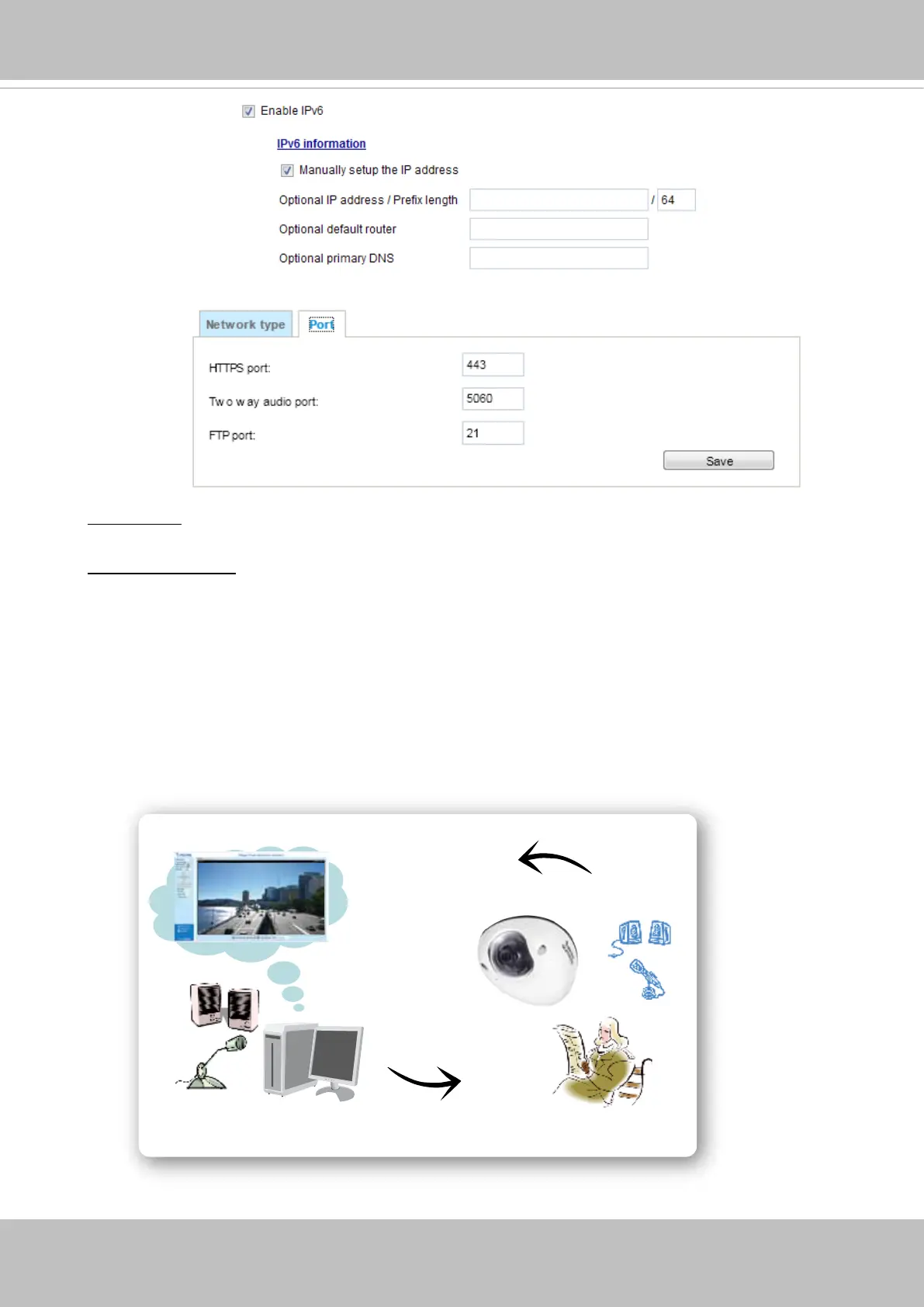 The Network Camera supports two way audio communication so that operators can transmit and
