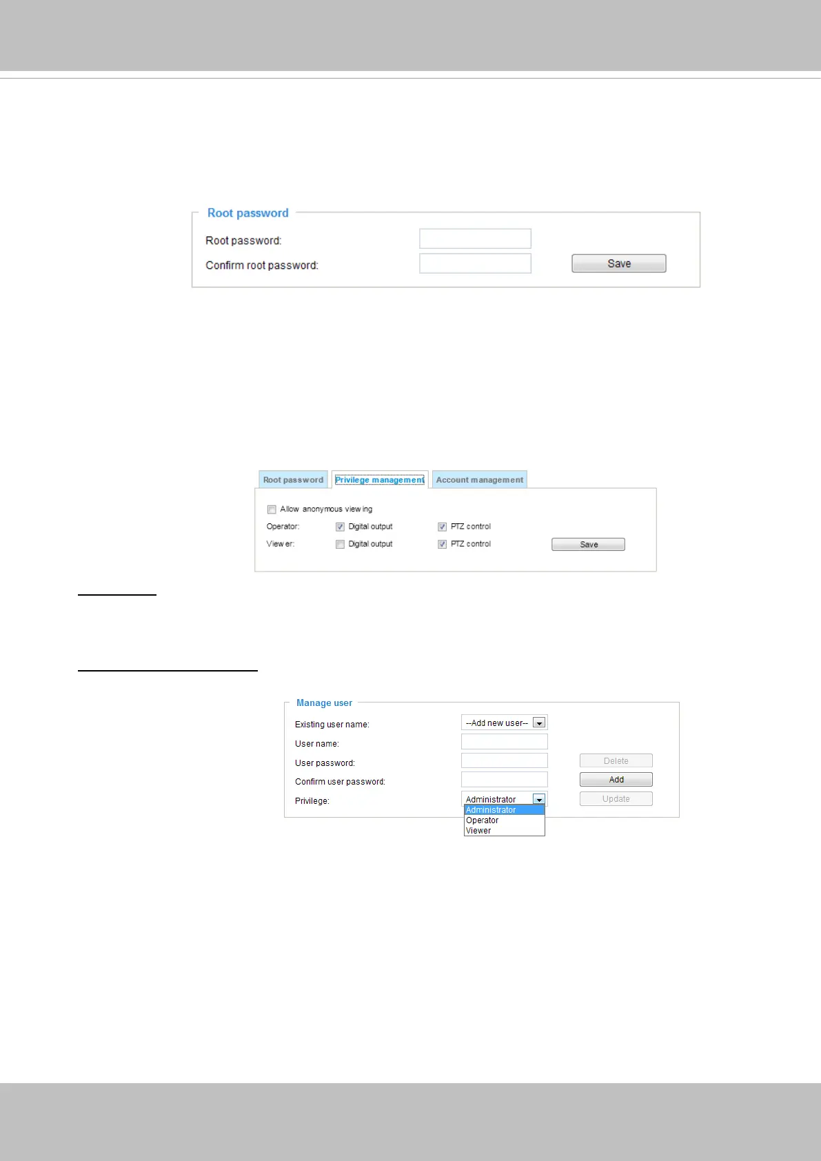 PTZ control: You can modify the management privilege for operators or viewers. Select or deselect