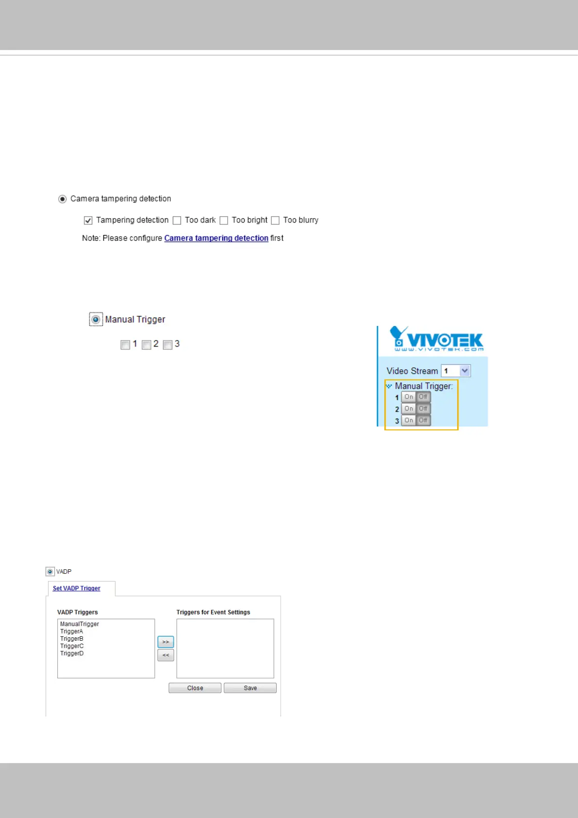 This option allows the Network Camera to trigger when the camera detects that is is being tampered