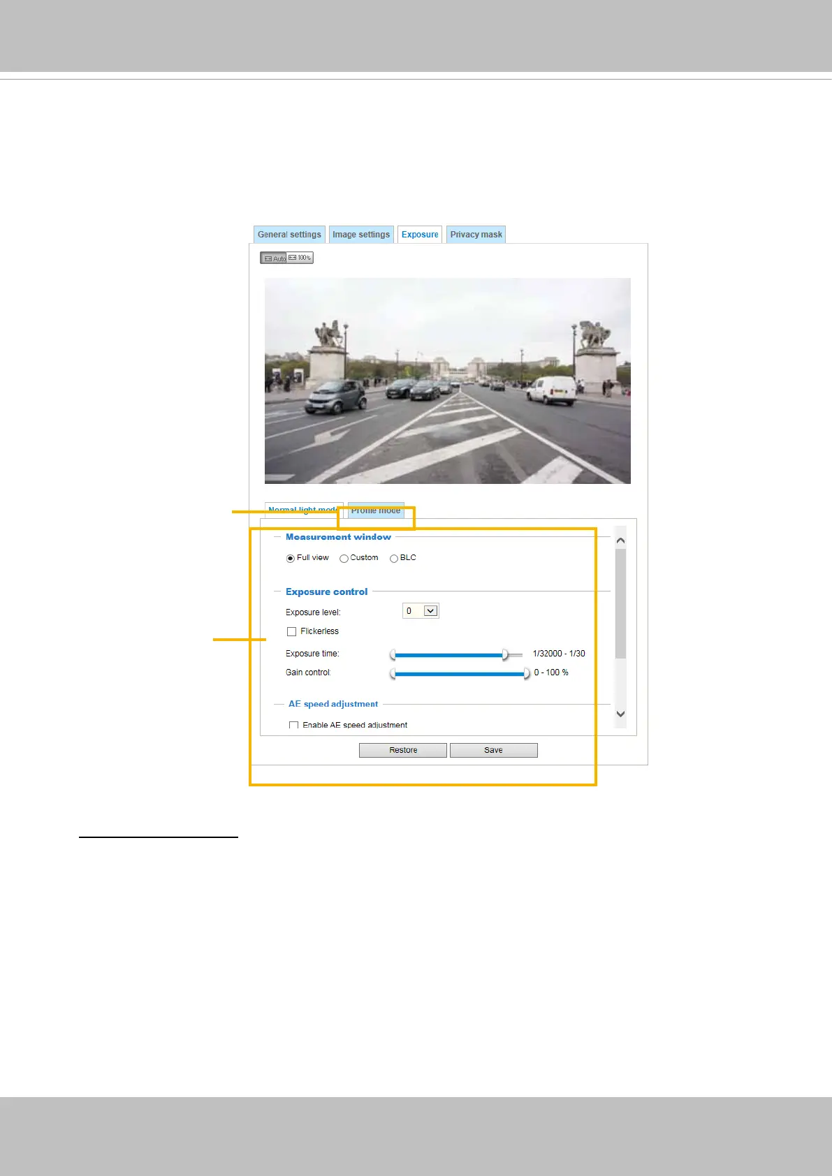 On this page, you can set the Exposure measurement window, Exposure level, Exposure mode,
