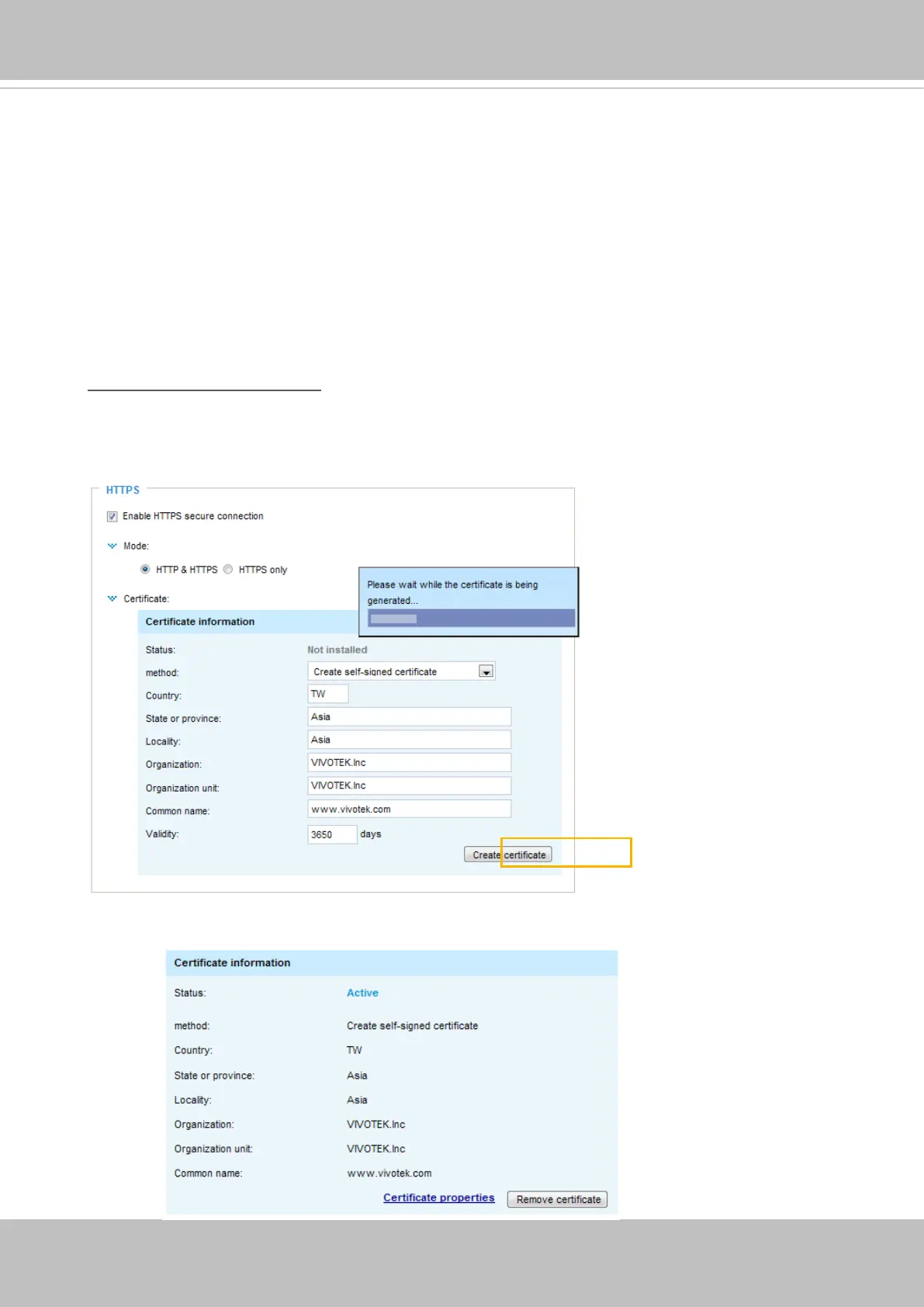 Before using HTTPS for communication with the Network Camera, a Certicate must be created