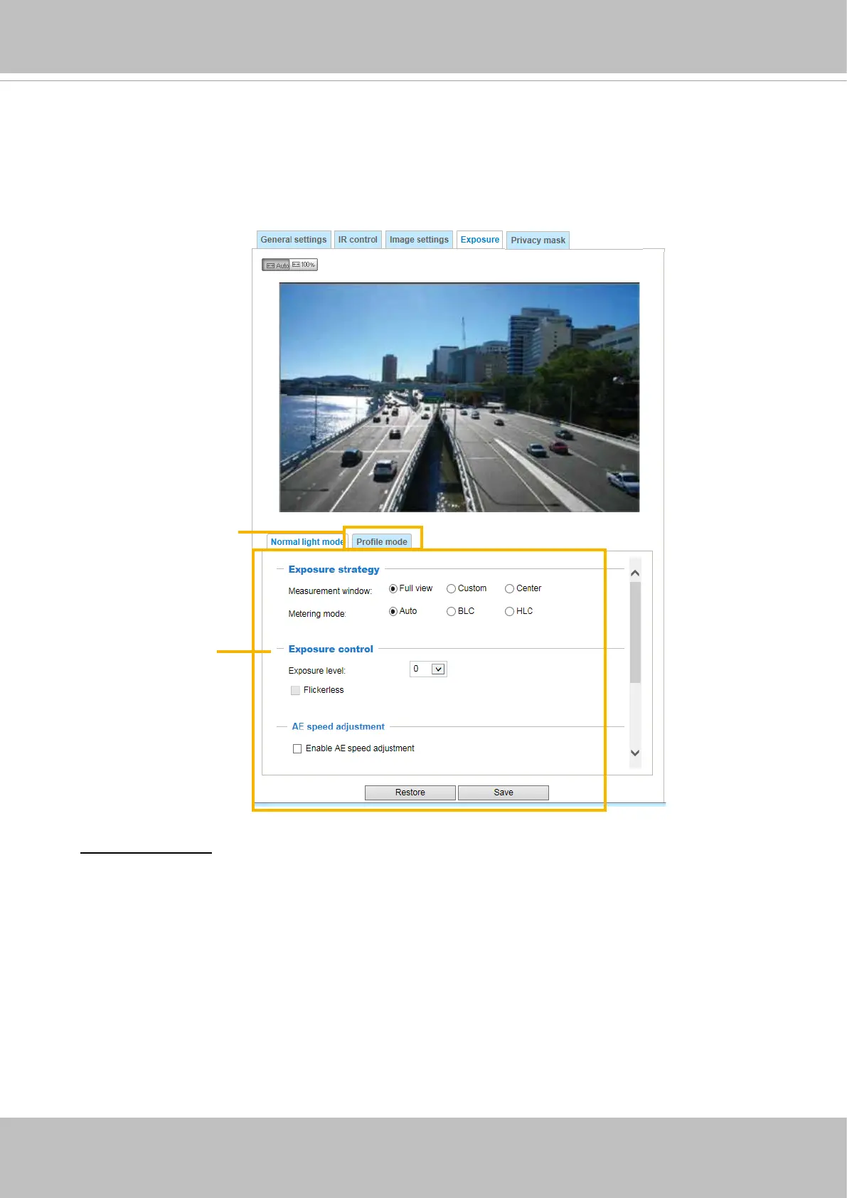 On this page, you can set the Exposure measurement window, Exposure level, Exposure mode,