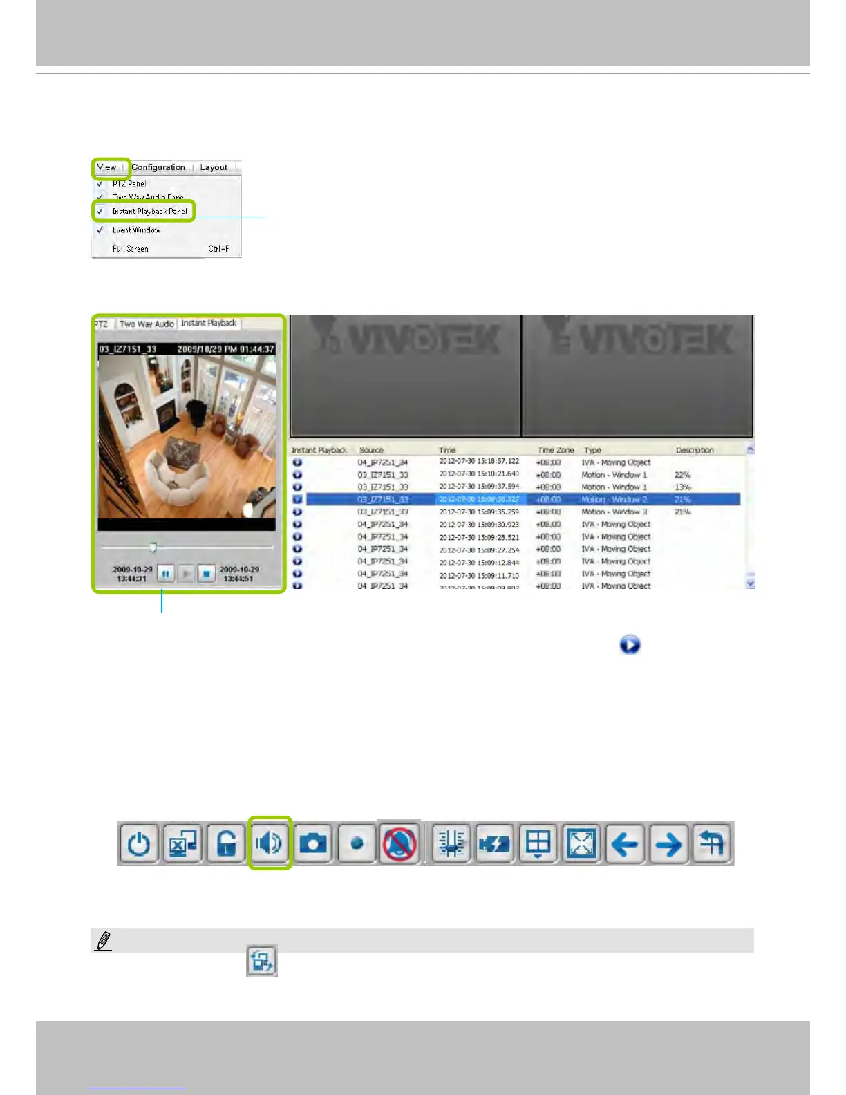 Instant Playback Window with a slide bar, play, pause, and stop function