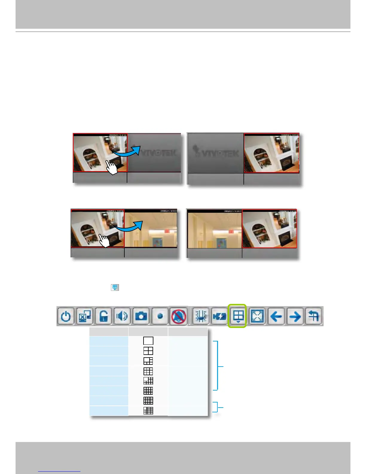 Some layout modes (1 x 1, 2 x 2, 1 + 5, 3 x 3, 1 + 12, 4 x 4) will divide all video channels into several