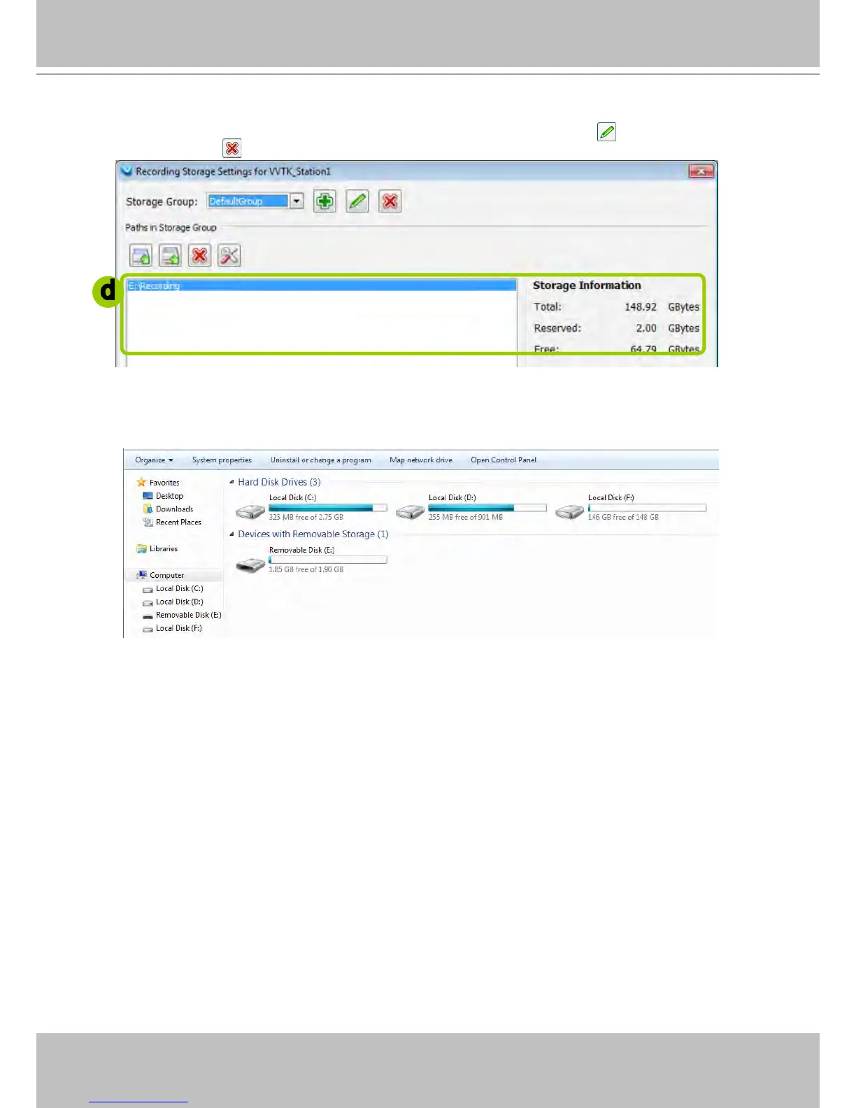 d. The default recording path is E:\Recording. The total space and free space of the disk is shown on