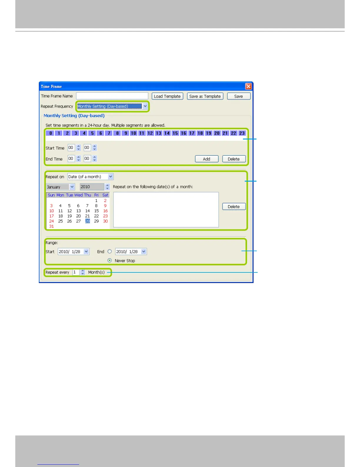 For repeat frequency--"monthly (day-based)", you can apply the time segments only on selected days of