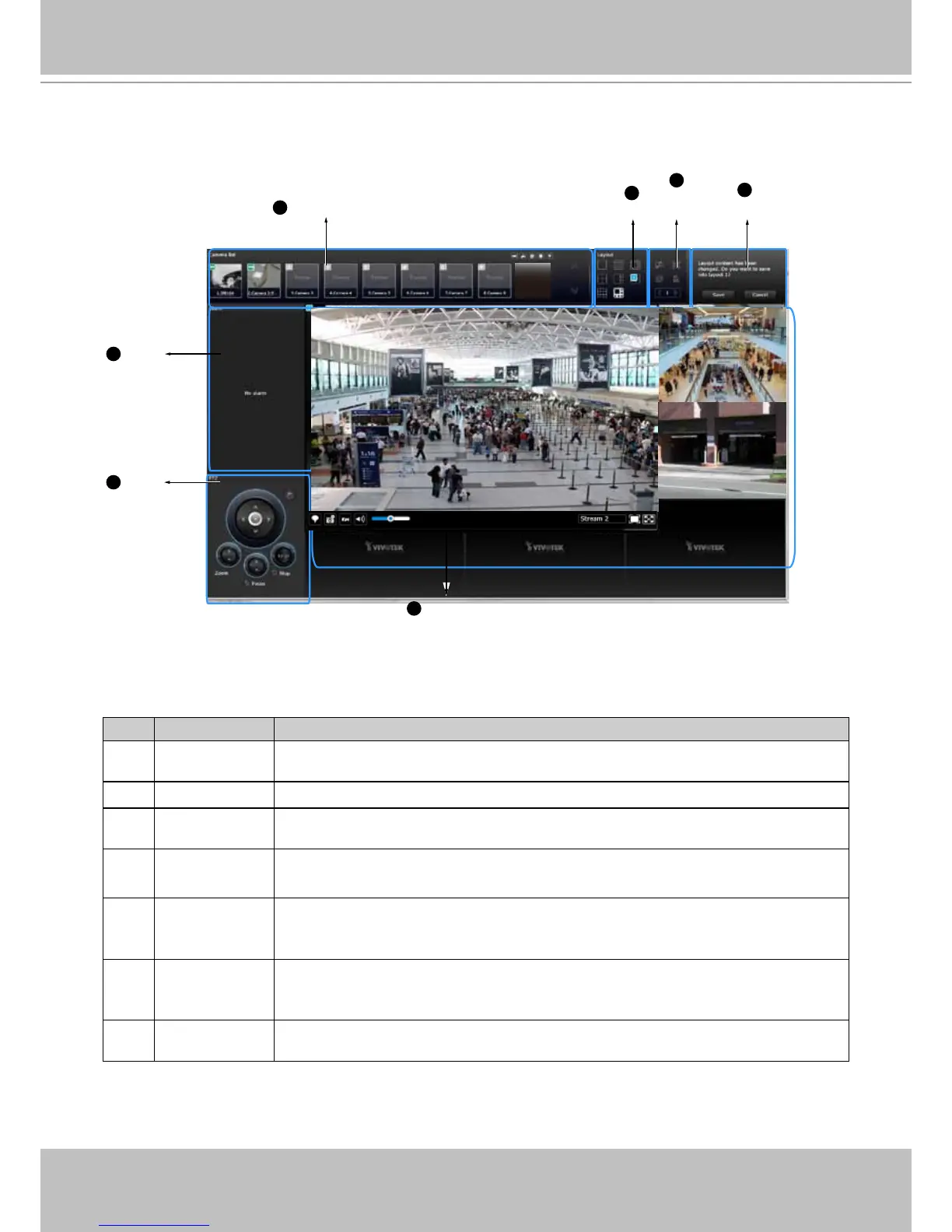 5 View cell panel Displays video streams from one or multiple cameras. Snapshot, streaming,