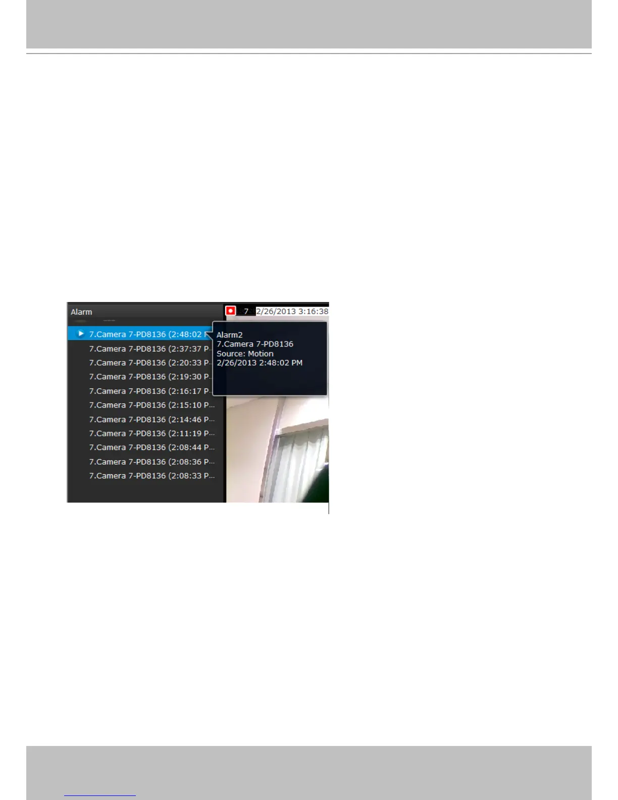To receive alarms from cameras, you need to congure alarm triggers in the Settings > Alarm