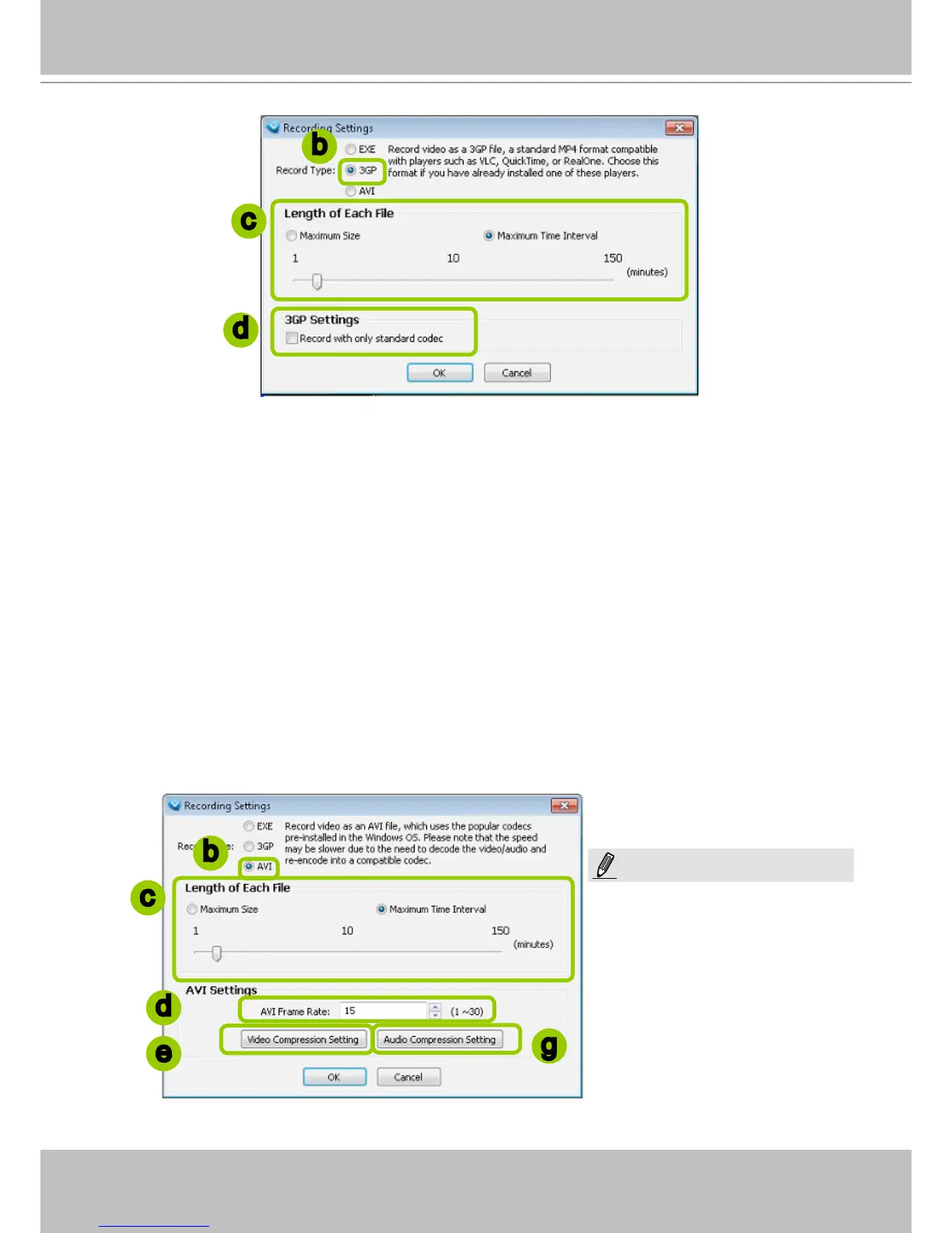 Record video as an AVI le, which uses the popular codecs pre-installed in the Windows OS. Please