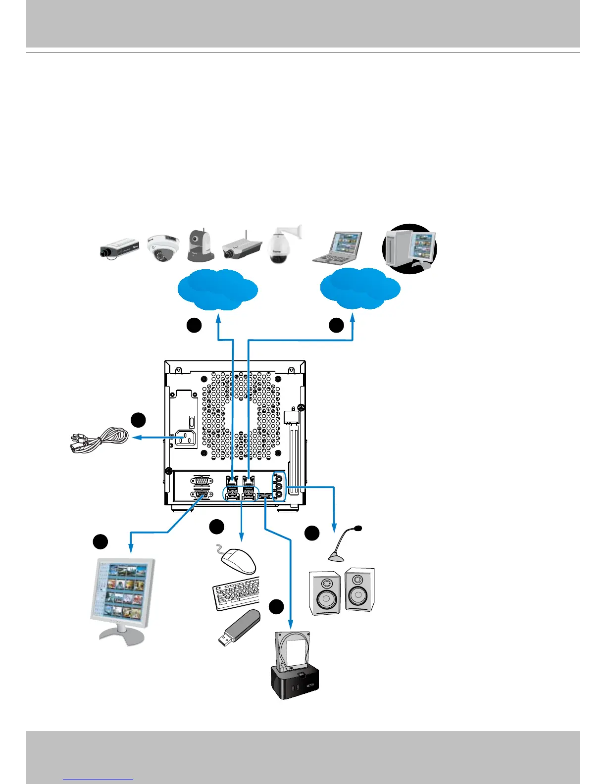 1 & 2. Connect CAT5 or better-quality Ethernet cables to cameras via a local, switched net-