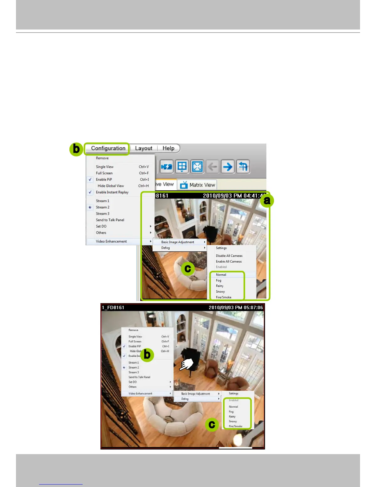 b. Click Conguration > Video Enhancement > Defog or