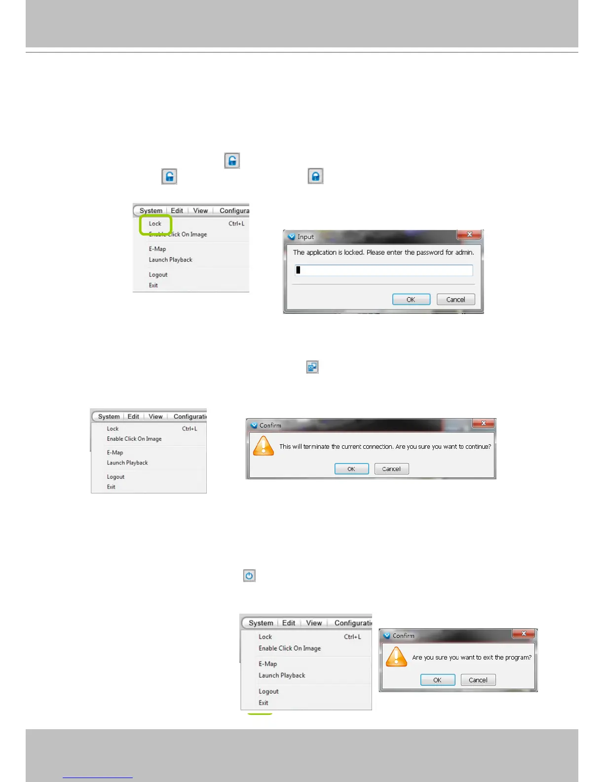 To lock LiveClient, click Unlock on the quick access bar or click System > Lock on the system
