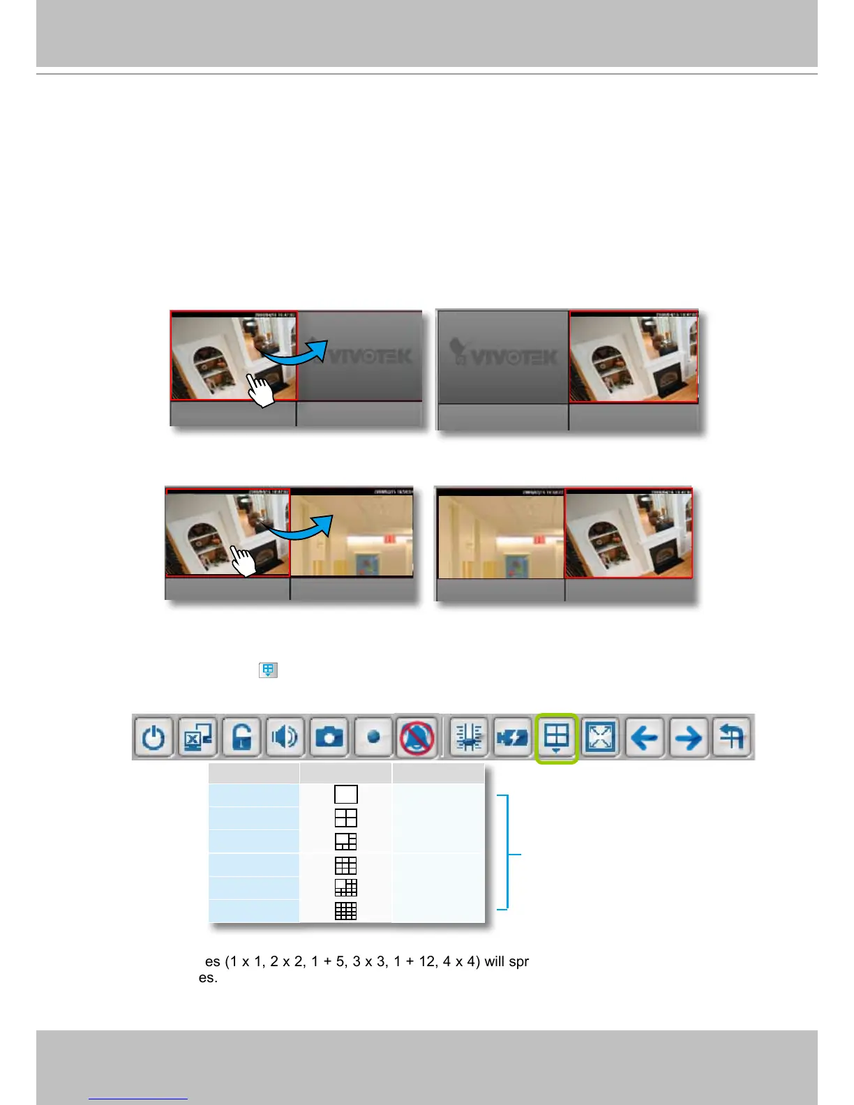 Some layout modes (1 x 1, 2 x 2, 1 + 5, 3 x 3, 1 + 12, 4 x 4) will spread the view cells of video channels