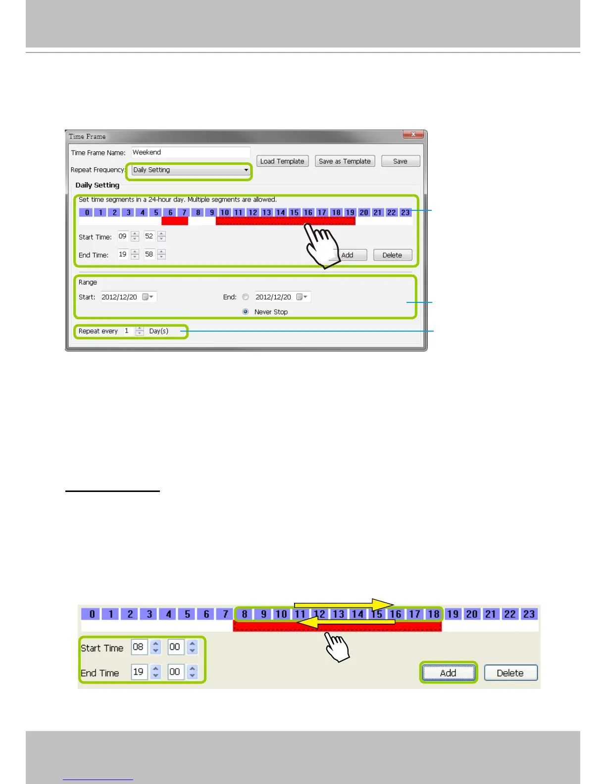 To set up daily repeat frequency, please congure the following items: Daily time segments, applicable