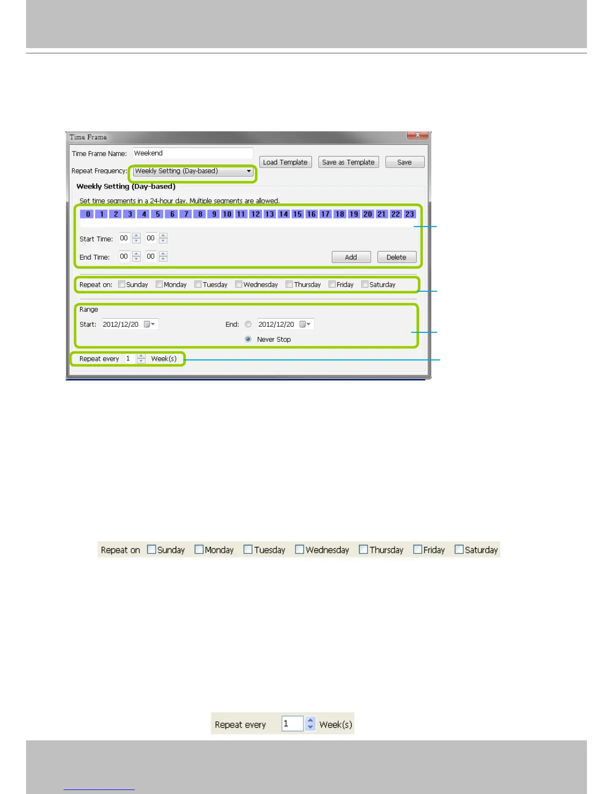 To set up Weekly (Day-based) repeat frequency, please configure the following items: Daily time