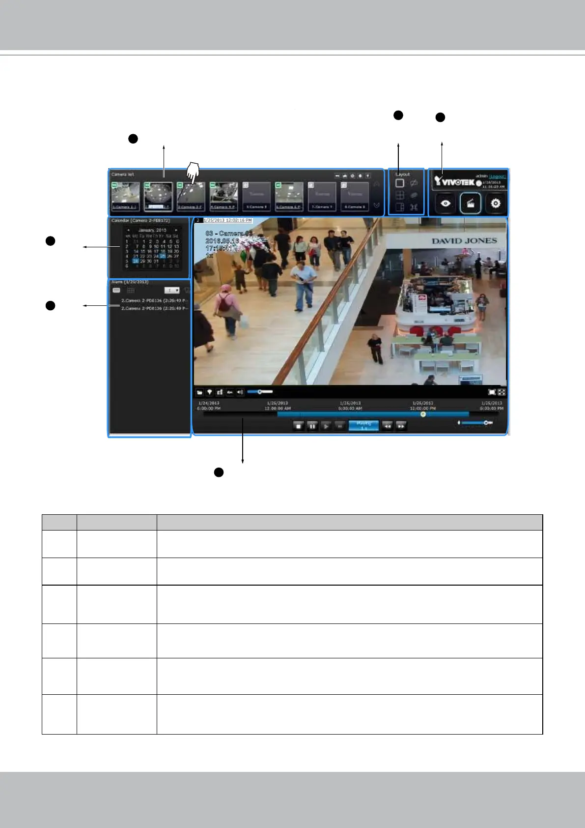 4 Playback panel Displays the playback functions. Snapshot, bookmark, and export functions are