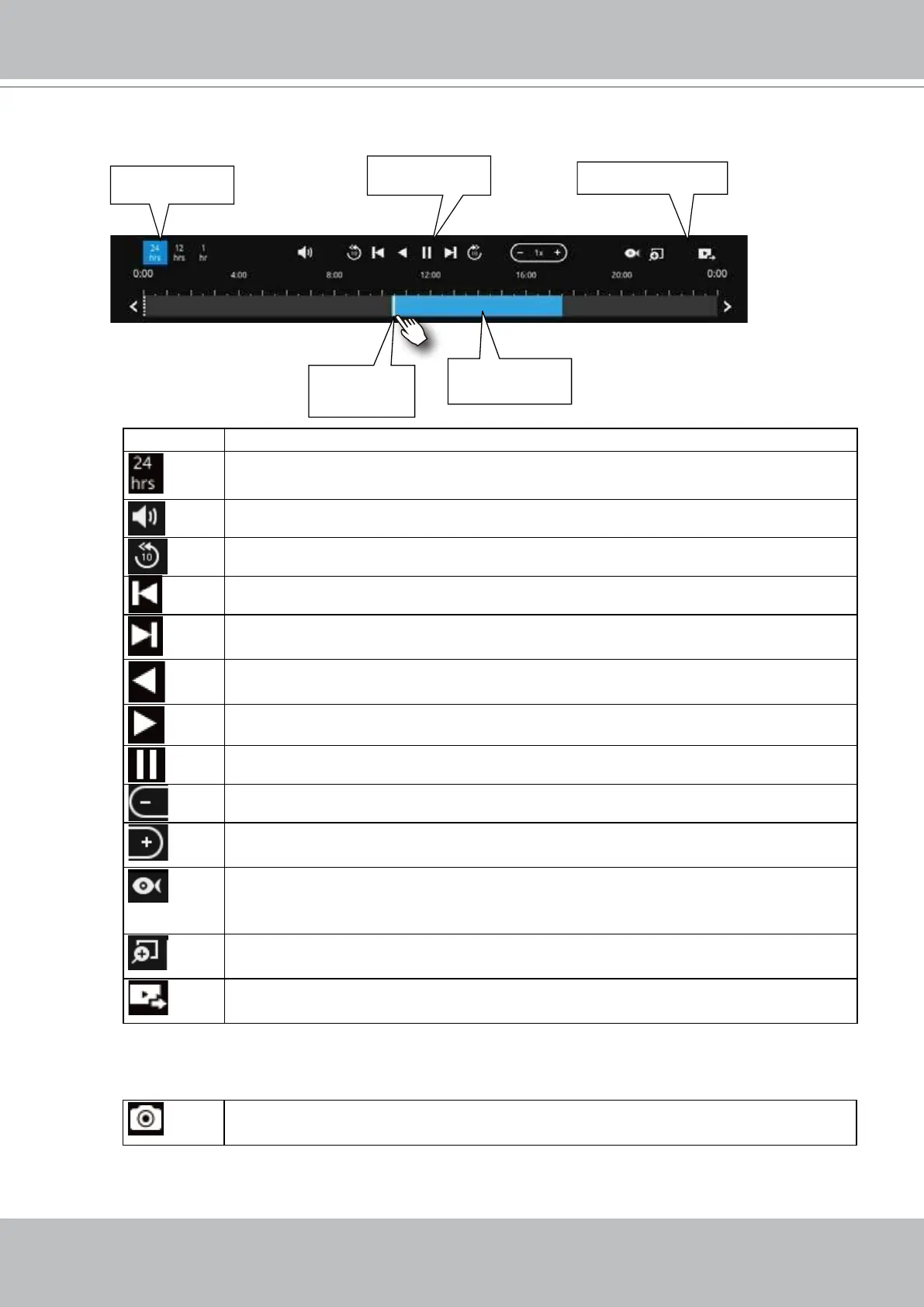 The timeline bar enables quick skimming through the recording. Its functions are
