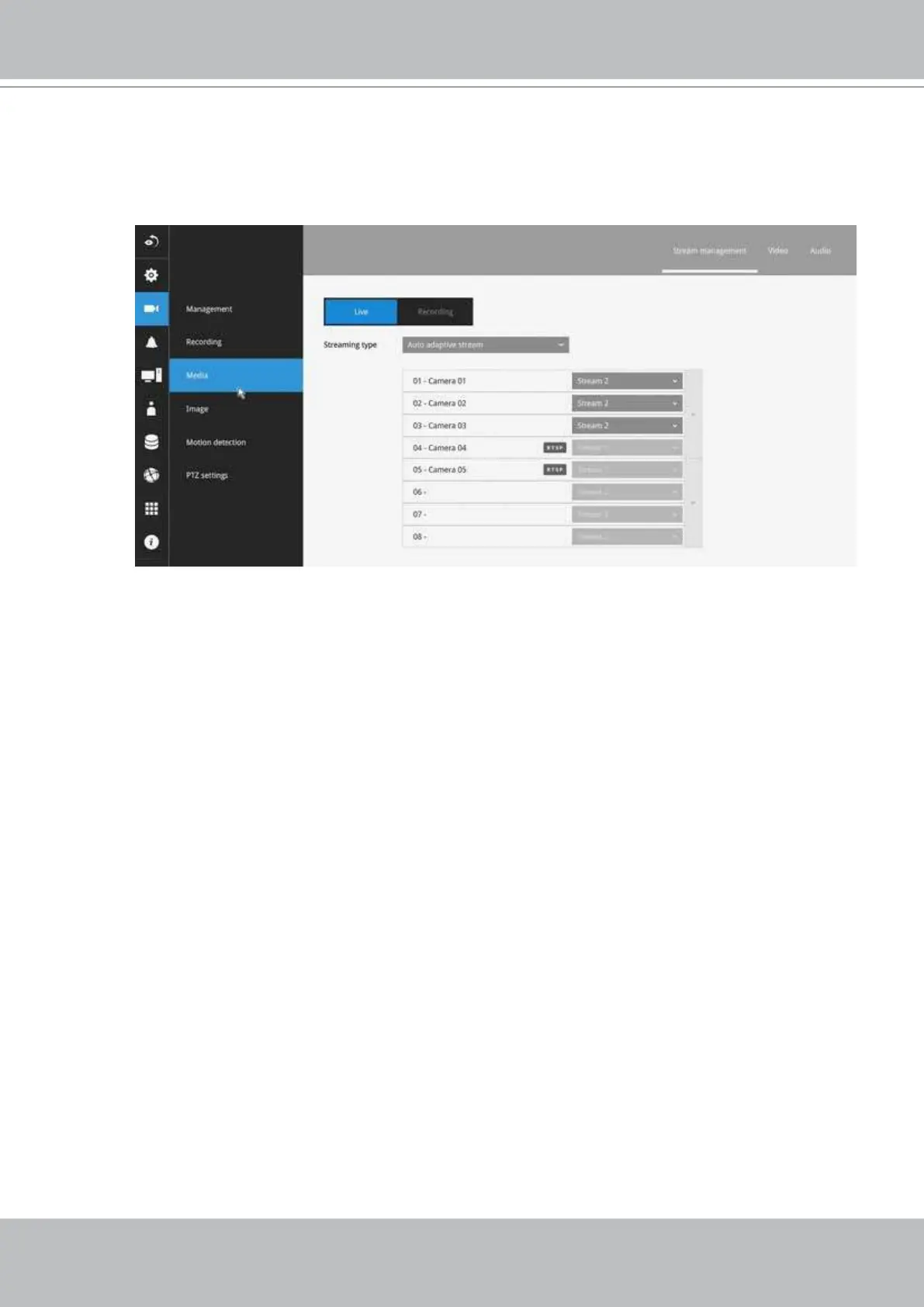 In Media > Stream managemeent page, the related Video, Audio, and stream