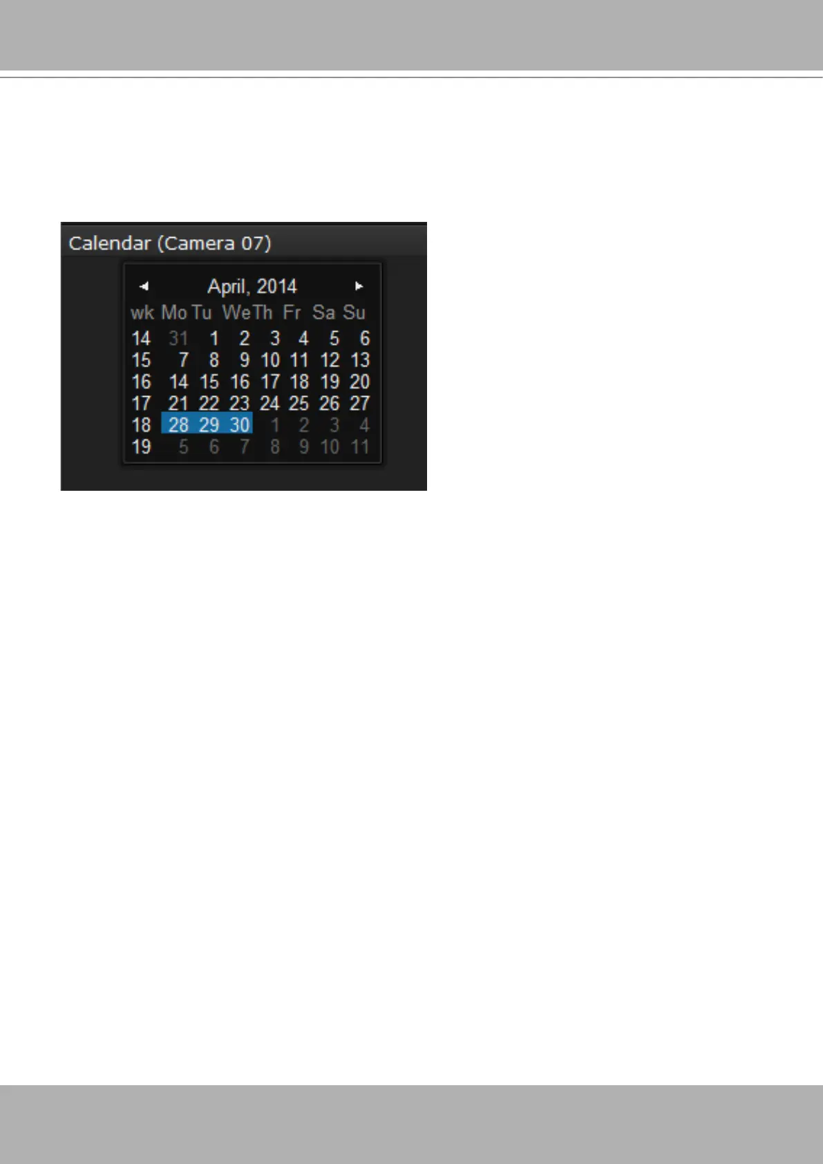 Double-click on any of the existing cameras to display the Calendar panel. Days with recorded