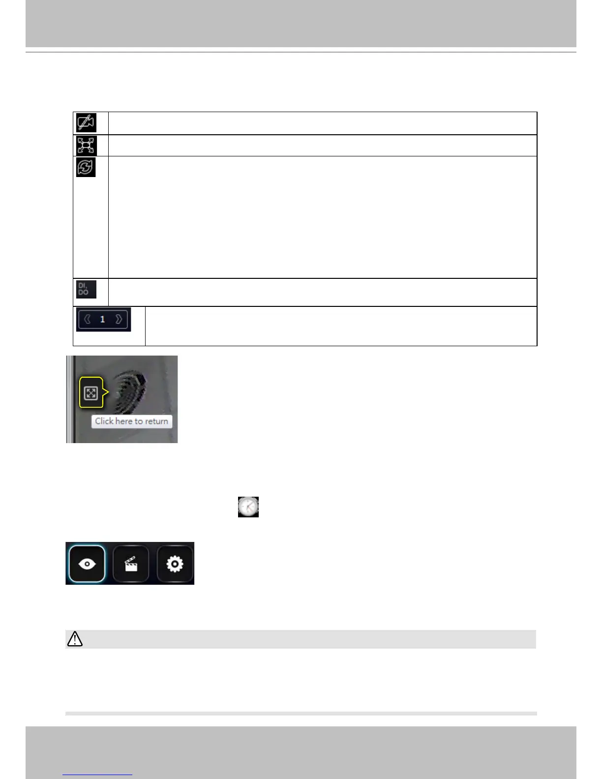 A logout button, system time panel , and 3 hot link buttons to access the Liveview, Search