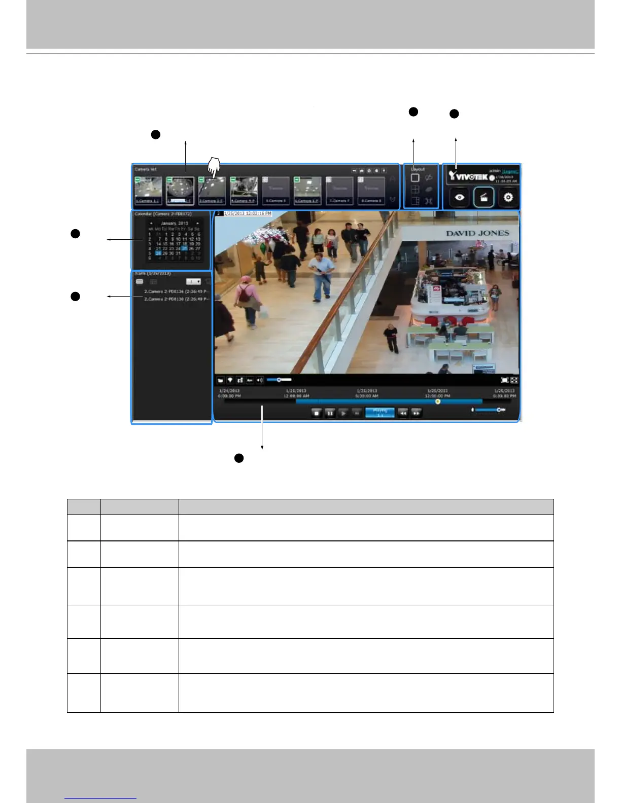 5 Alarm panel Reports alarms transmitted via cameras' DI connections or those by the Motion