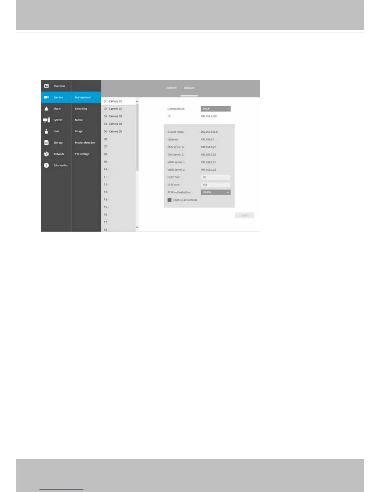 You can select DHCP as the method for cameras to acquire IP addresses, or you can manually