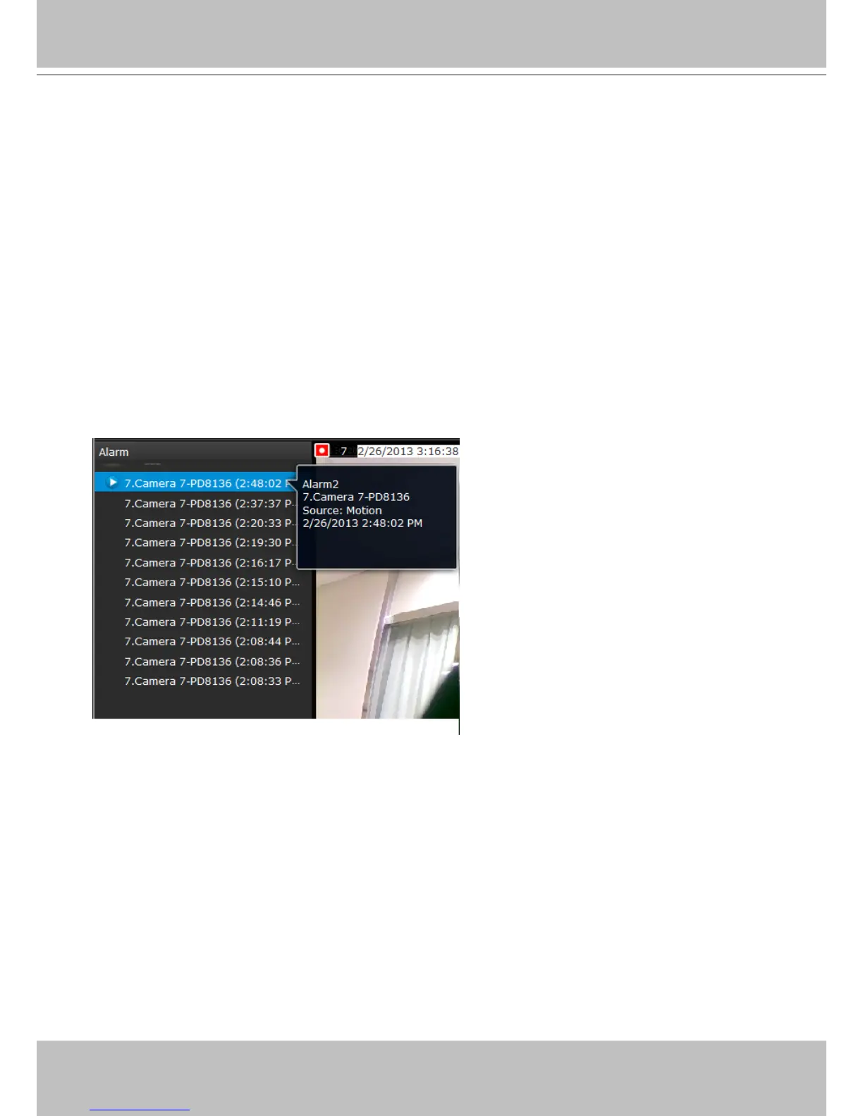 To receive alarms from cameras, you need to congure alarm triggers in the Settings > Alarm