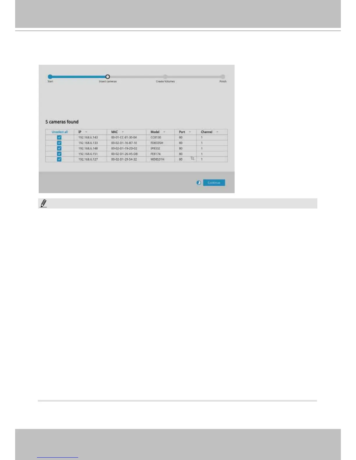 cameras you want to exclude from the conguration. Click Continue to proceed.