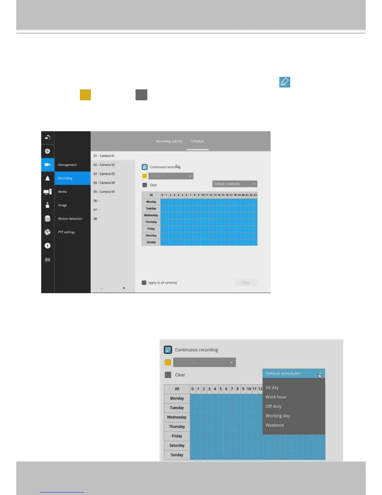 4. Repeat the process on individual cameras or select the Apply to all checkbox if the schedule