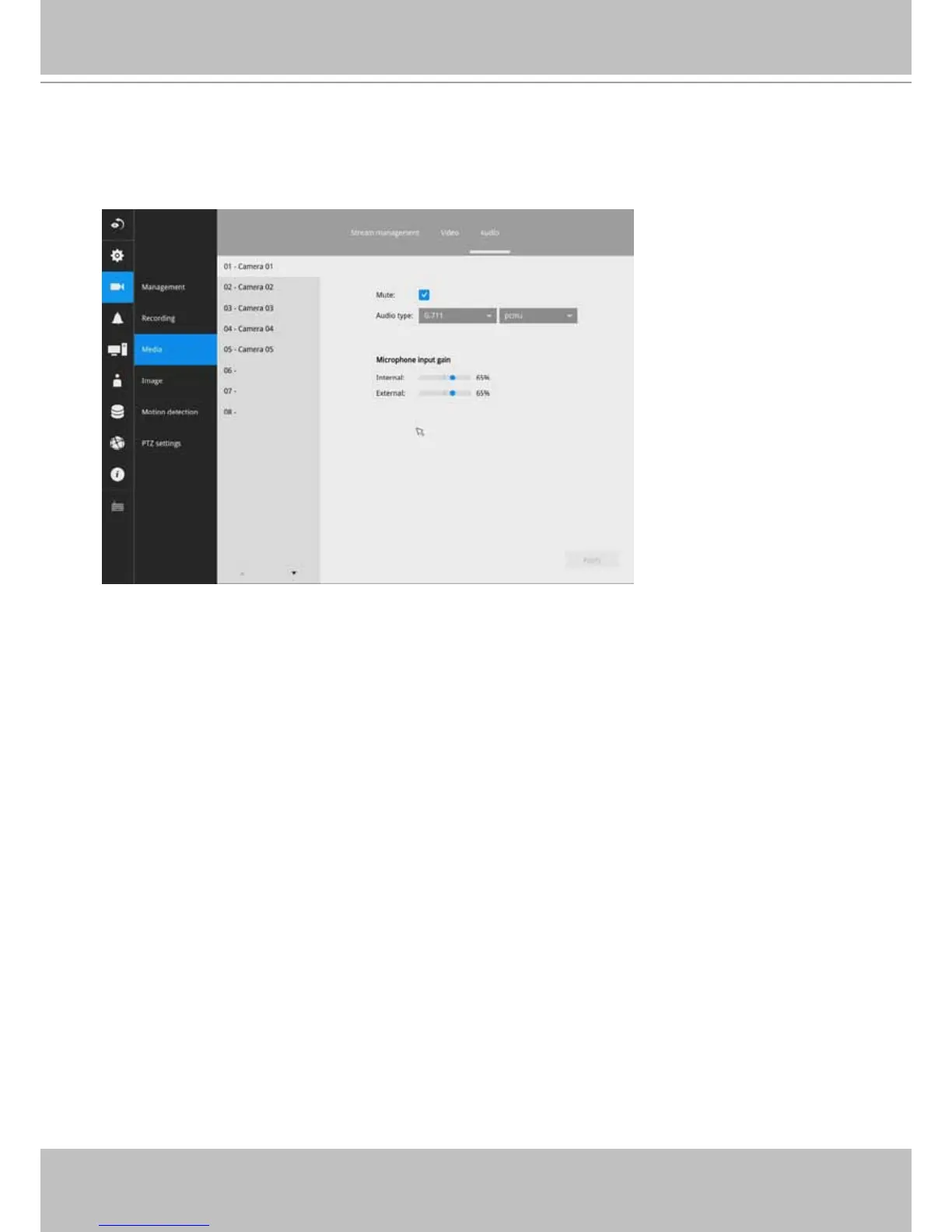 The Audio window allows you to congure all audio codec, sampling rate, and Microphone input