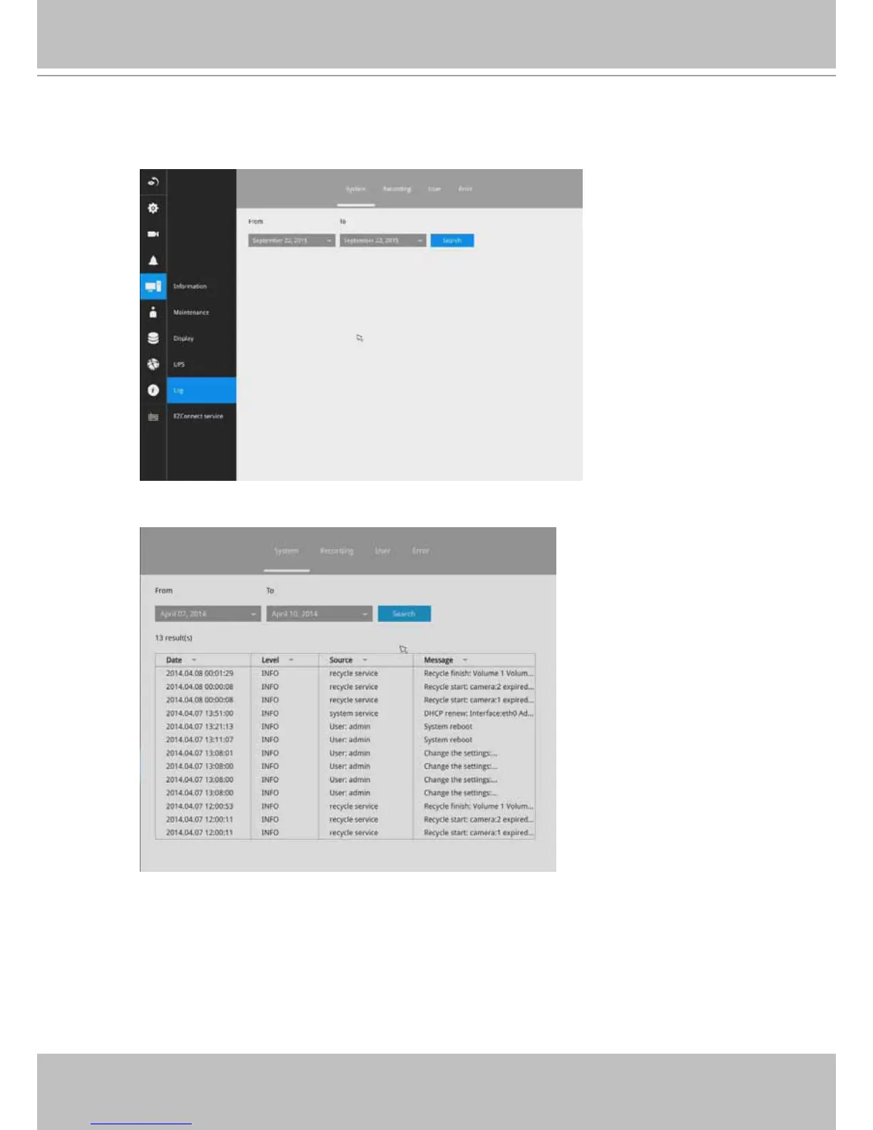 To display system logs, select a range of time and click on the Search button.