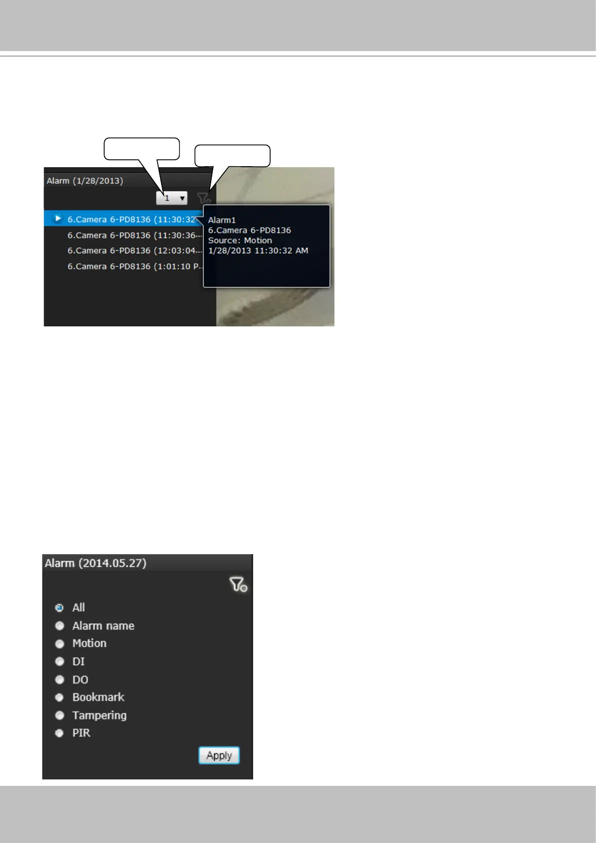 search criteria by Alarm name or alarm type by Motion detection, DI, DO, Tampering, PIR, or