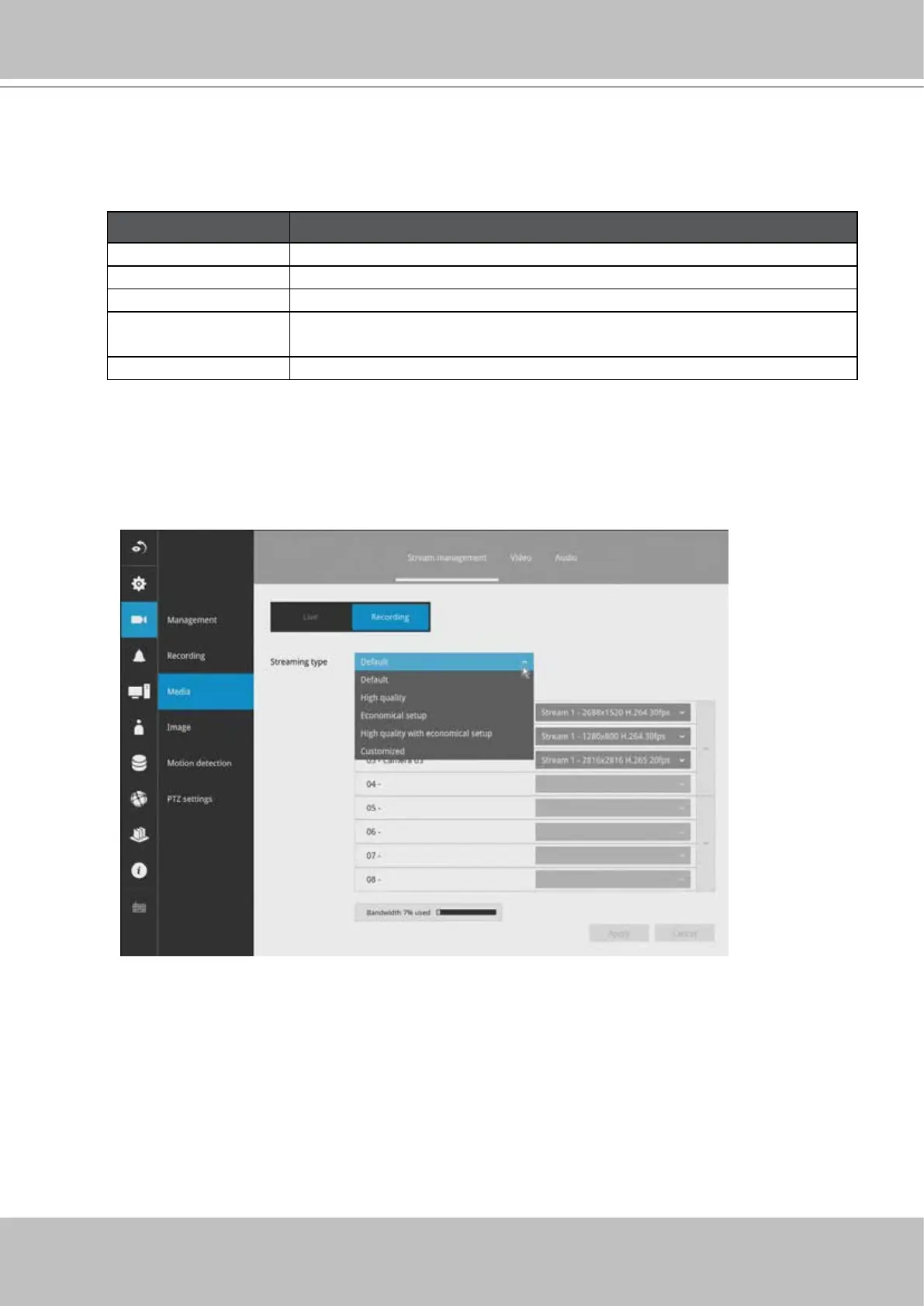 preset conditions to congure the resolution, image quality, frame rate, and the bandwidth
