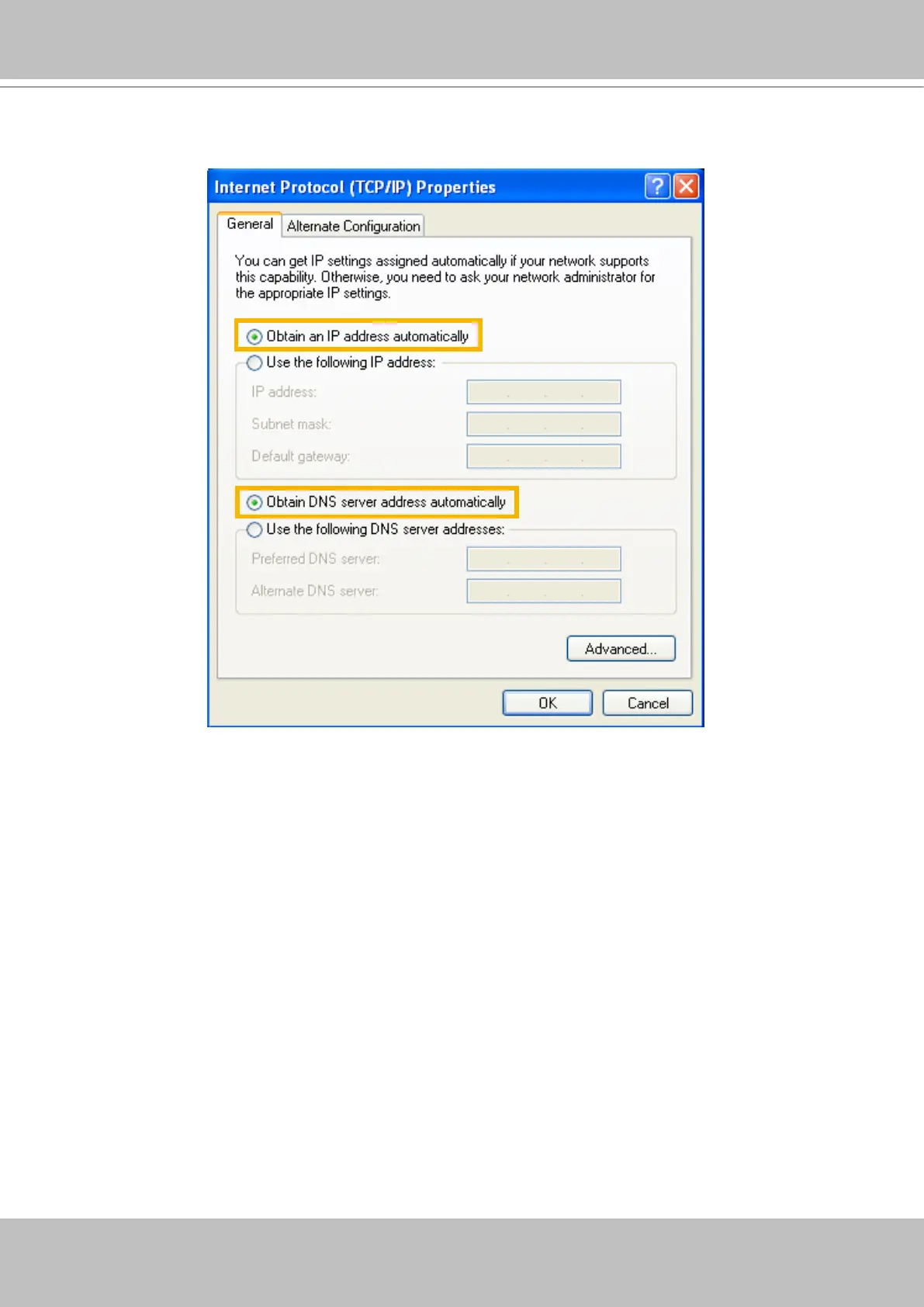 d. Select "Obtain an IP address automatically" and "Obtain DNS server address automatically"