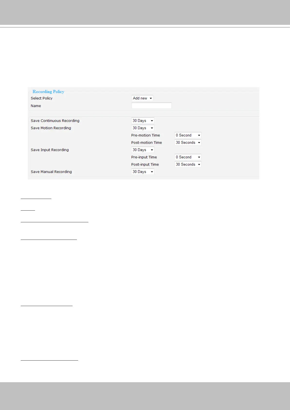 ■ Please congure the following items to add a new Recording Policy/Recording Mode: