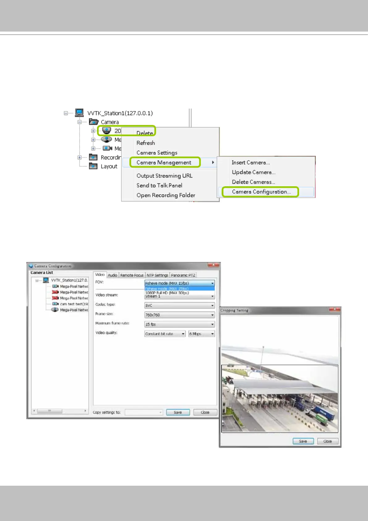 selecting a camera on the device tree, and right-click to select Camera Management > Camera