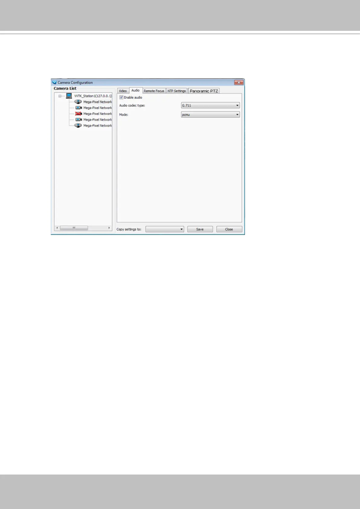 If audio feed is preferred, configure the audio codec type, sampling bit rate, and operating mode