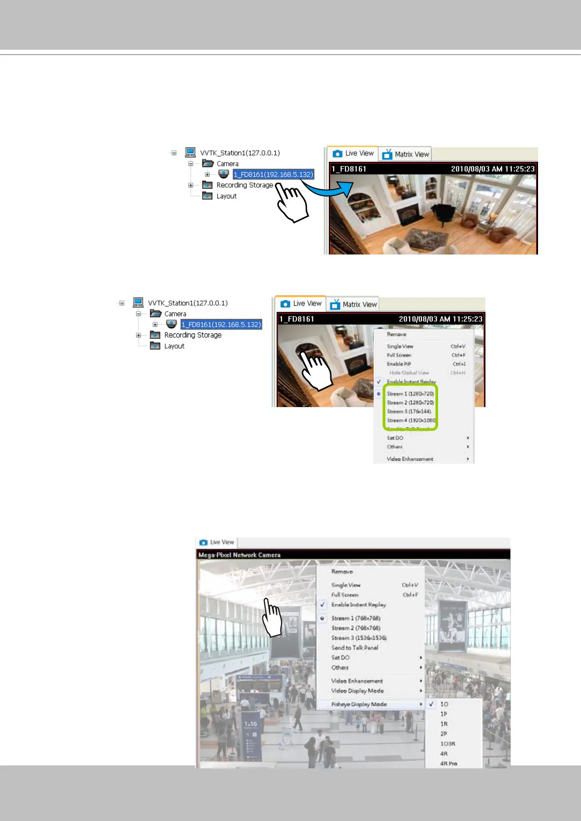 display Regional, Panoramic, or the combination of different views, right-click on a fisheye