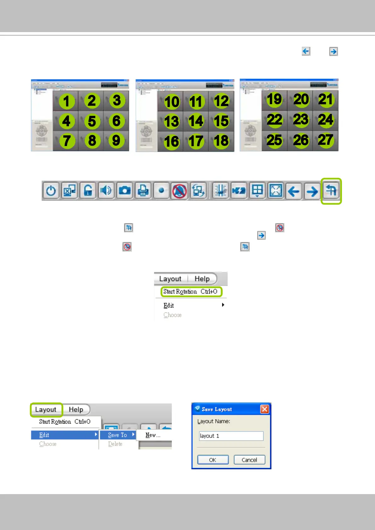 For example, under the 3x3 layout mode, you can switch among the pages by clicking and on