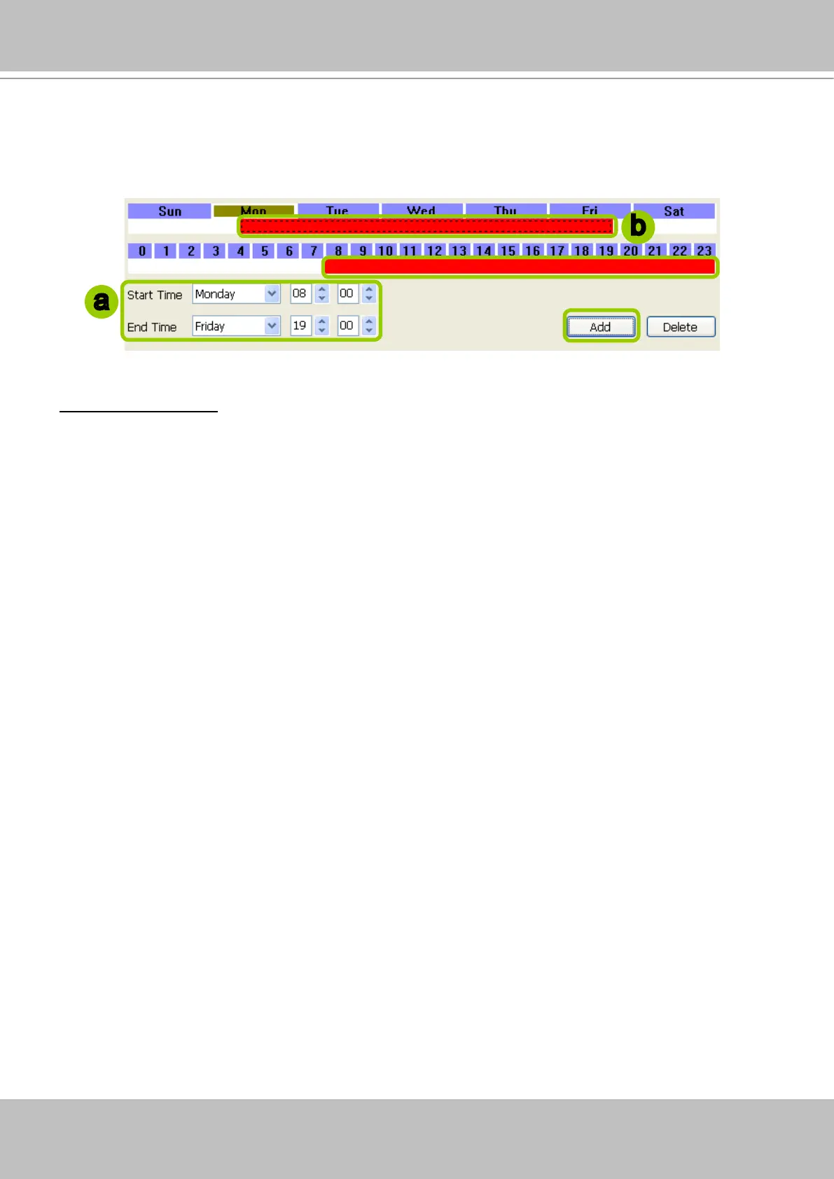 a. Directly select a day and enter the value in the Start Time and End Time fields, then click Add.