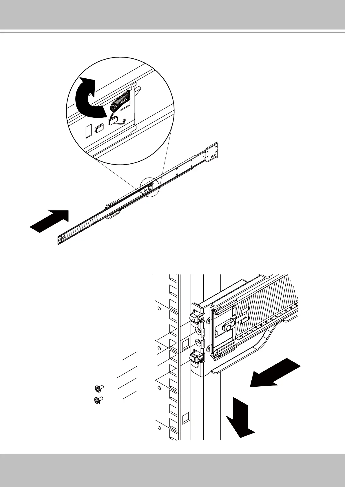 4. Attach the slide rails to the front rack post by hanging them to the rack holes. You may secure