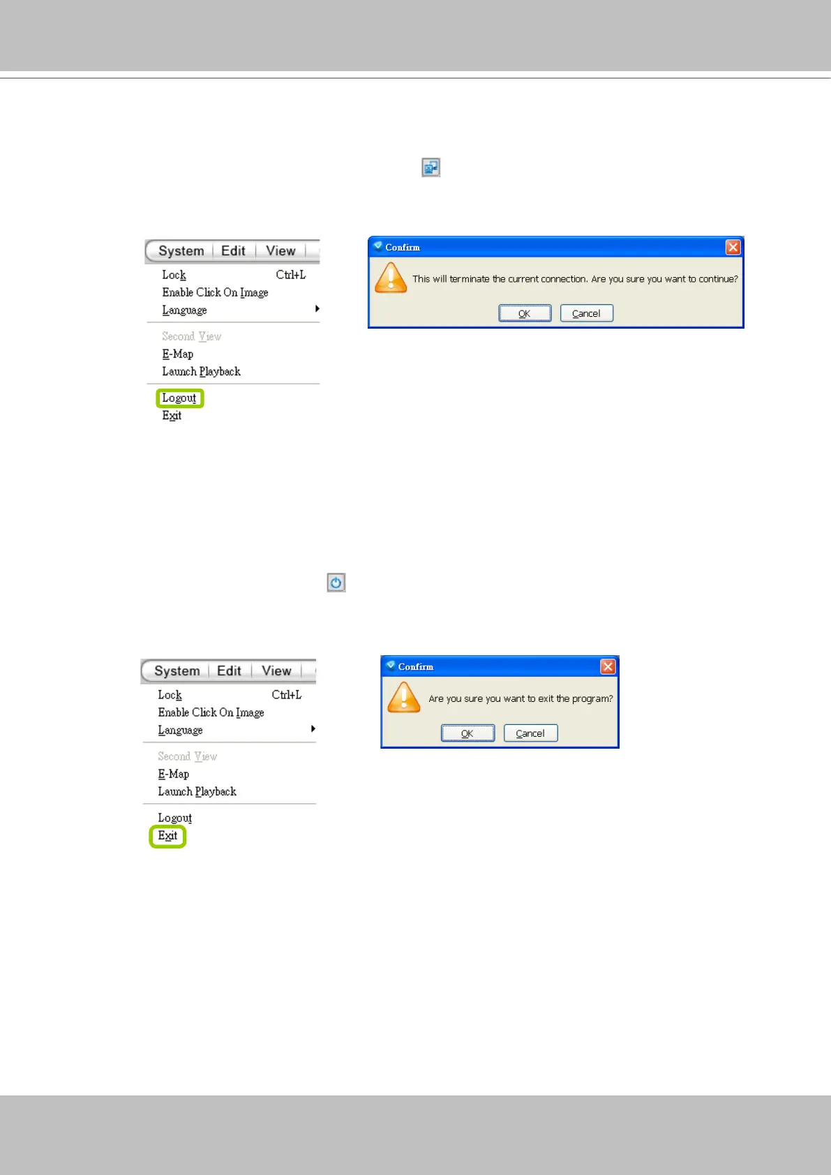 Logout on the menu bar. A conrmation window will pop up. Click OK to conrm or Cancel to
