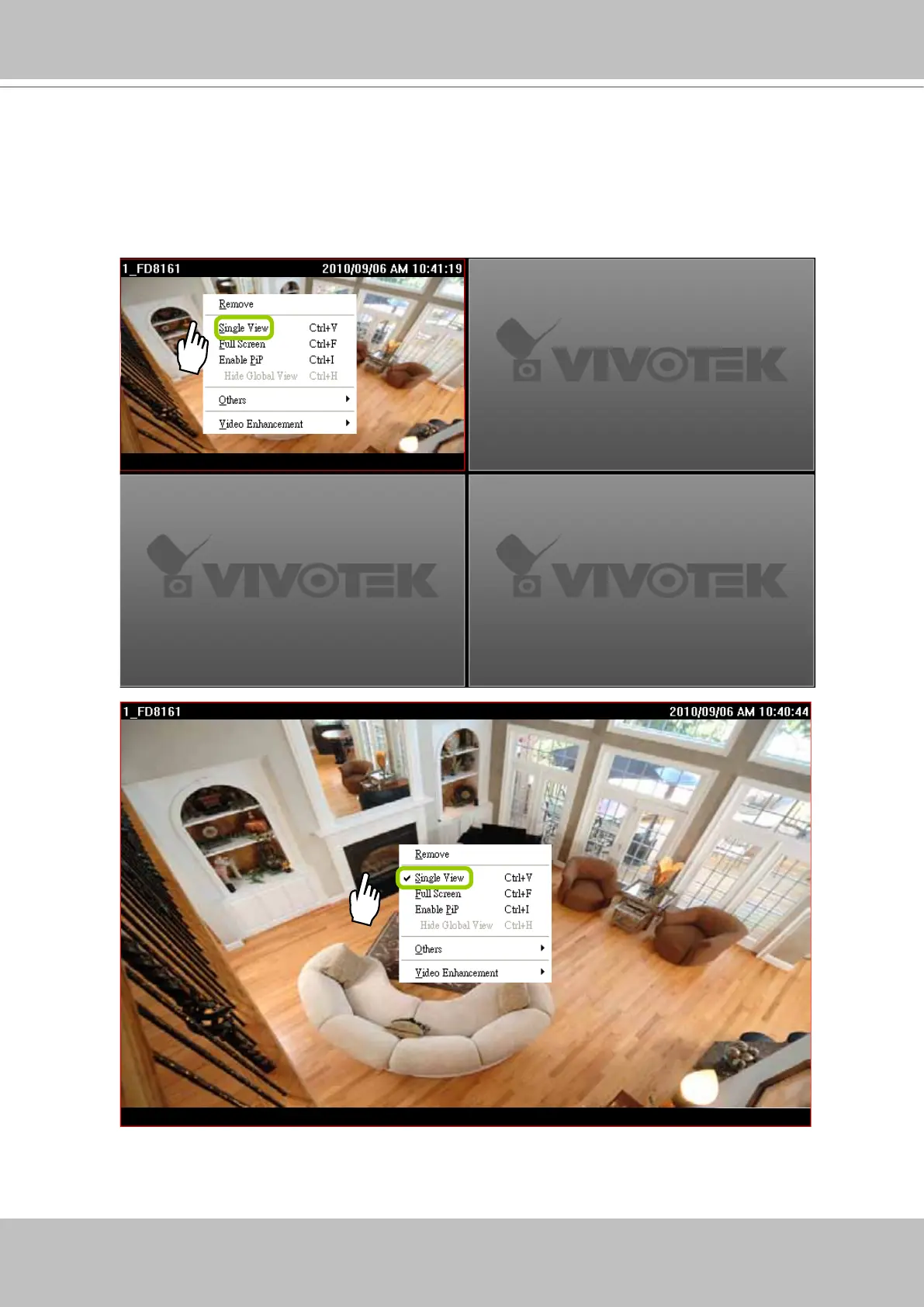 Double-click the video cell, or right-click the video cell and selec Single View. The focused video will