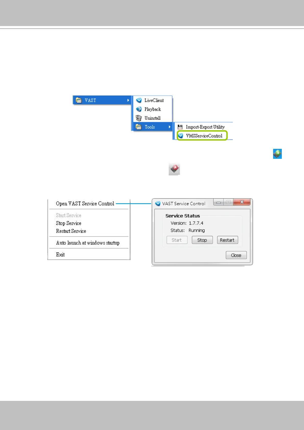 VAST service control tool is a tool for server control and for user to be aware of the VAST Server status.