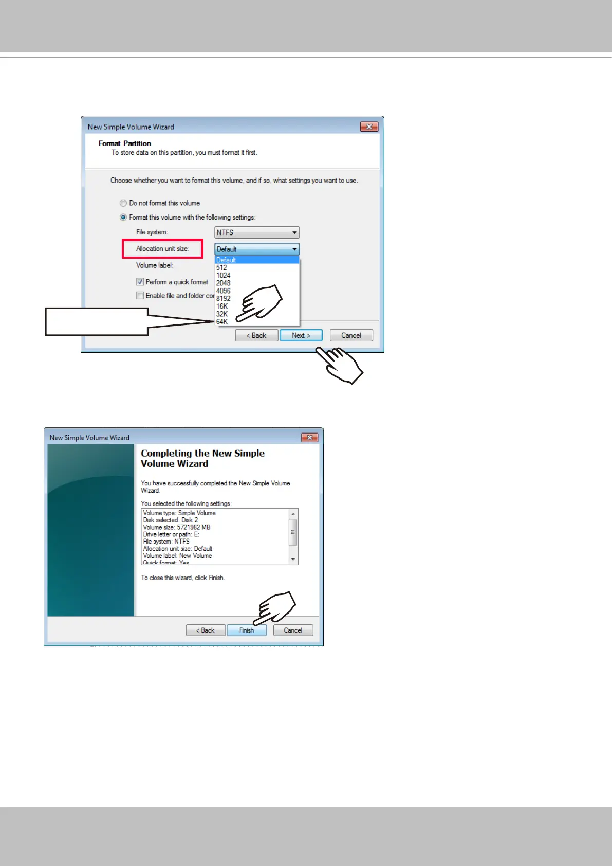 19. On the Format Partition page, select the Allocation unit size as 64KB. When done, click