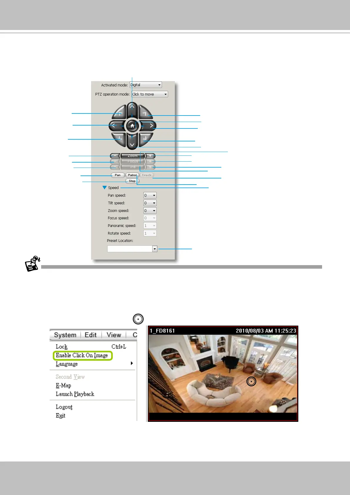 Click System > Enable Click On Image to use the mouse for the control of the PTZ and E-PTZ functions in the