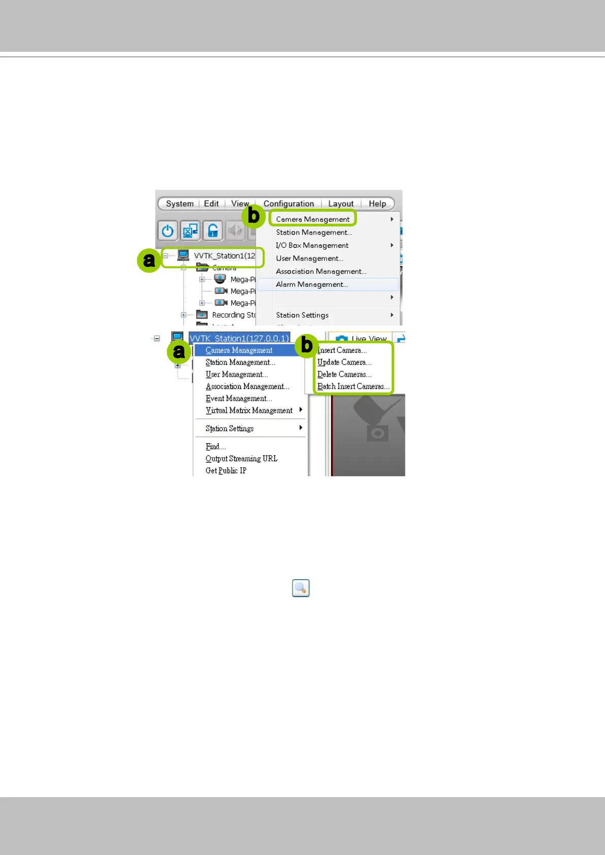 b. Click Conguration > Camera Management on the menu bar (or right-click the station, then select