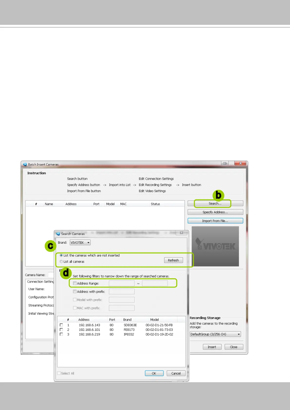 b. The Batch Insert Cameras window will pop up. Then click Search to open the Search Camera