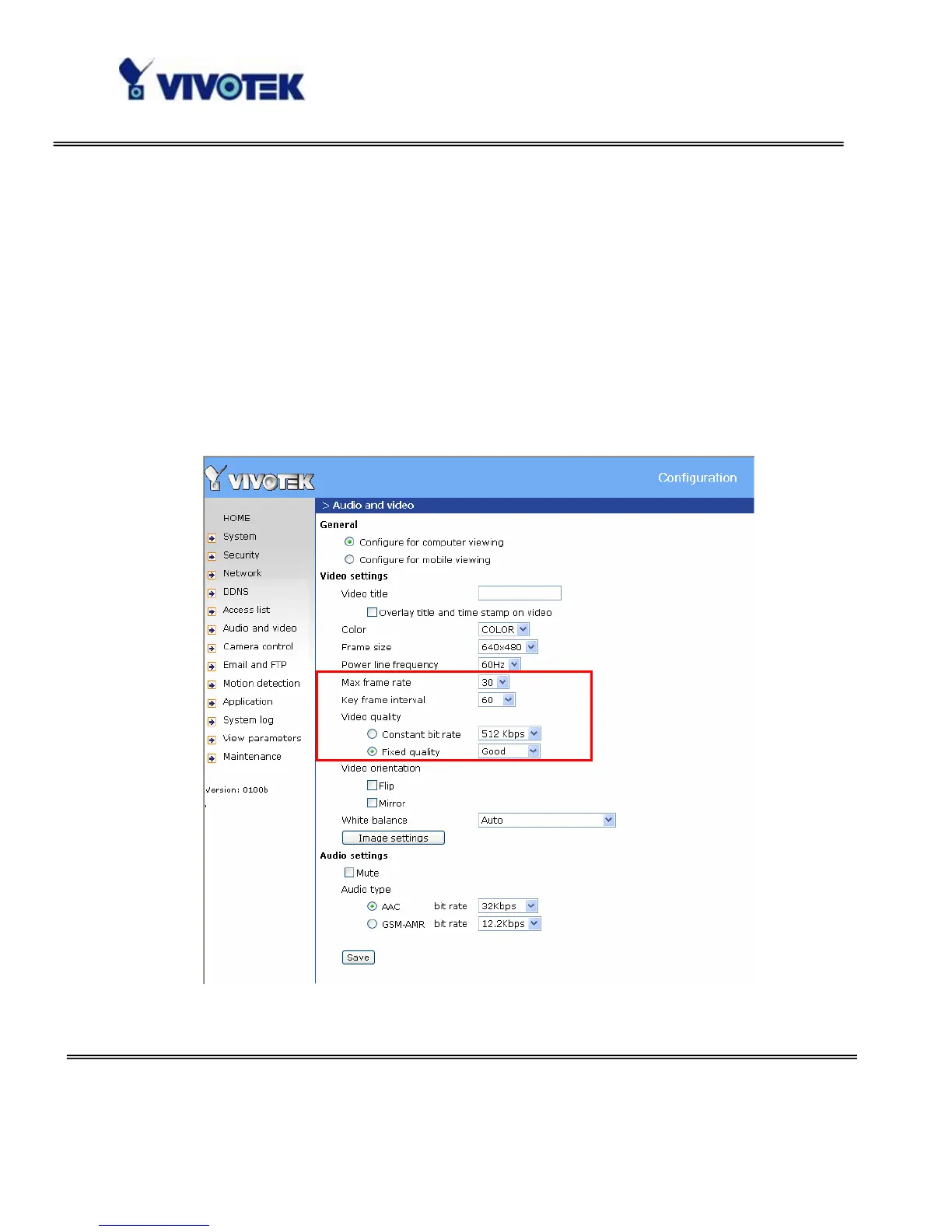 “Maximum frame rate”, “Constant bit rate”, and “Fix quality” on the Audio and Video