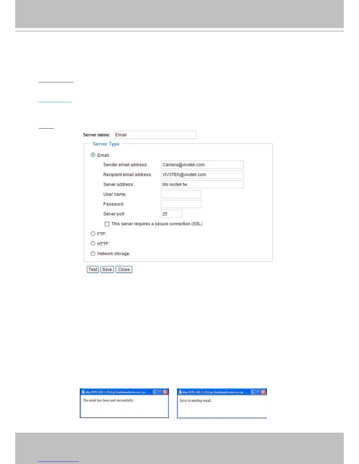 To verify if the email settings are correctly congured, click Test. The result will be shown in a pop-up
